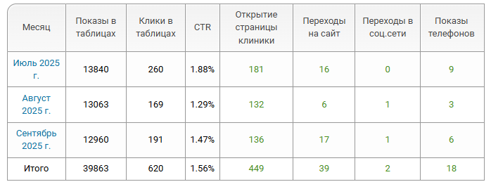 - Показы в таблицах — сколько раз компания была показана в списках на главной странице, по районам, метро и услугам.