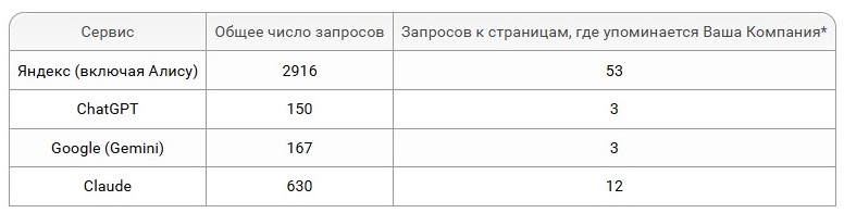 - как часто компания упоминалась в ответах нейросетей;